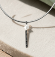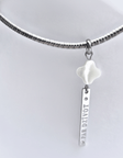 Raksturojums:▪️ Materiāls: 316. klases nerūsējošais tērauds un perlamutrs▪️ Krāsa: metāliski sudraba▪️ Gravējums: “Par Dzīvot” ar dekoratīviem kristāliņiem▪️ Plāksnītes izmērs: 5 x 0.4 cm▪️ Ķēdītes garums: 44 cm▪️ Aizdare: klasiska