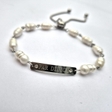 Raksturojums:▪️ Materiāls: 316. klases nerūsējošais tērauds un dabīgas upes pērles▪️ Krāsa: metāliski sudraba▪️ Gravējums: “Par Dzīvot” ar dekoratīviem kristāliņiem▪️ Plāksnītes izmērs: 3 x 0.5 cm▪️ Akmens izmērs: apmēram 6 x 8 mm▪️ Kopējais garums: 16 cm + regulējama ķēdīte 10 cm▪️ Piemērota plaukstas apkārtmēram: ~14–18 cm▪️ Aizdare: ērts slīdošais aizdares mehānisms ( viegli regulējams)